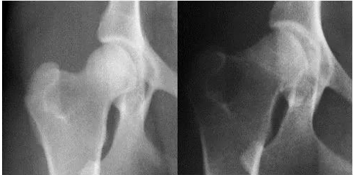 2006年3月9日,美国专利Kolla 2 研究团队经过临床试验证明服用【骨精华】主要成份II型骨胶质(kolla2)六周后,患有关节发育异常的犬科动物恢复了正常运动功能,随后的X光射线显示髋关节软骨明显增厚,恢复正常。以下为服用II型骨胶质Kolla2前、后X光对比图: