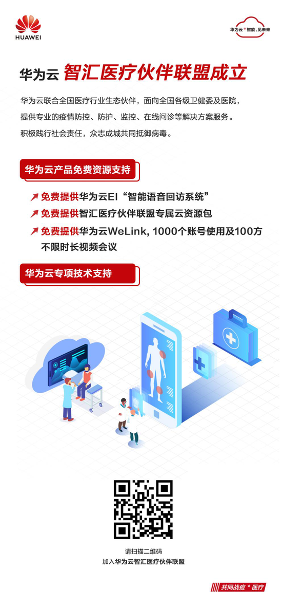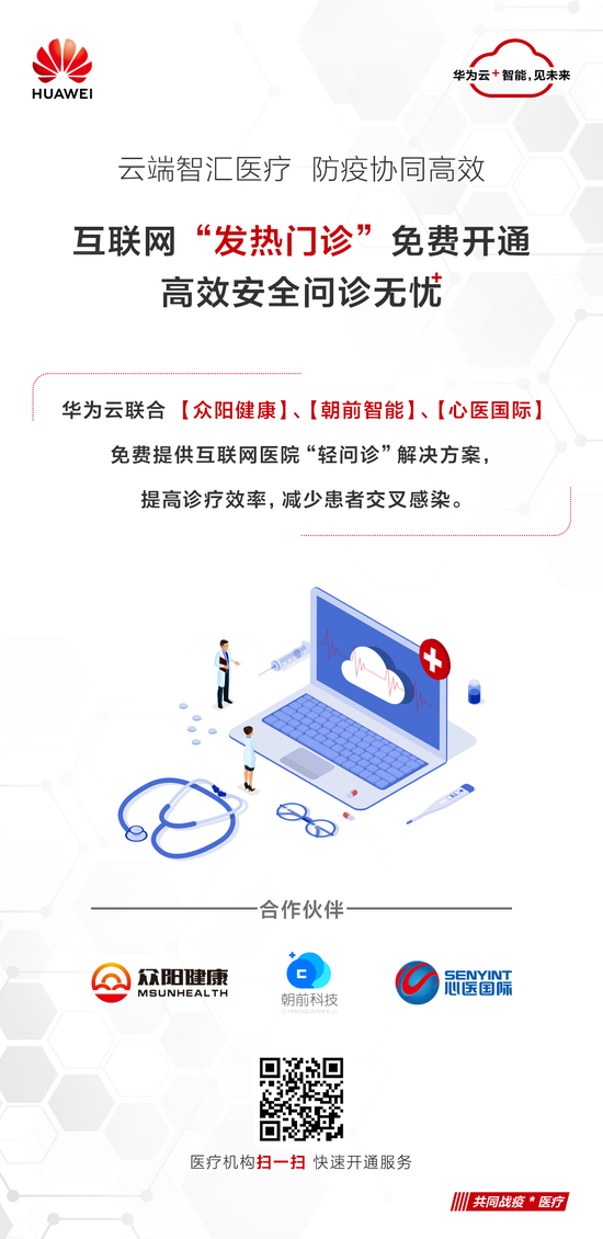 在这特殊时期,华为云联合医疗行业伙伴成立“智汇医疗伙伴联盟”,助力在线诊疗更加高效。目前,众阳健康、心医国际、朝前智能均为“联盟”成员。华为云将持续联合三位伙伴,帮助医院实现智慧门诊、智慧病房、健康管理等业务,为居民提供线上的咨询服务,针对复诊患者提供线上处方、线上检查检验、药品配送等互联网医院服务,实现线上、线下医疗服务一体化。