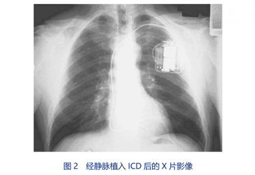 器械治疗方面,目前公认的预防SCD特别有效的方法是预防性植入体内的除颤器,即埋藏式心律转复除颤器,缩写为ICD,它可以埋藏在人体内,当患者发生室速、室颤时,ICD系统能够自动充电及通过除颤电极释放电能除颤,来挽救患者的生命(图1),成功率在95%以上,而一旦在医院检查出来是心脏性猝死高危人群,就必须安装ICD。